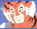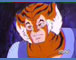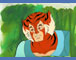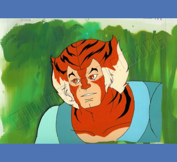 Tygra headshot from episode 16 - The Fireballs of Plundarr. The original background is handpainted of a forest opposite the Mutant's Castle Plundarr. It takes place when Tygra and Willa are spying on the castle. It is possible that the background pictured is not the matching background, however this background has been stapled to this cel for about twenty years since being packed away after production!