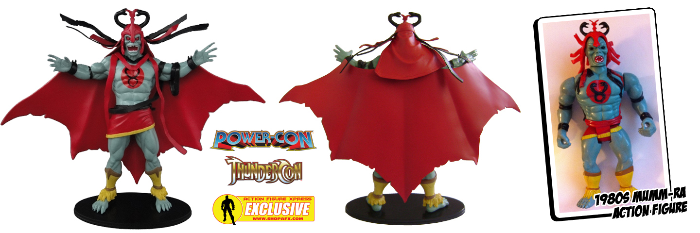The intimidating 8 inch Mumm-Ra with a larger than life pose towers over the 6 inch Icon Heroes Lion-O. The cartoon accurate sculpted nemesis sold at three major conventions with an exclusive Ma-Mutt companion staction. An alternative paint “Retro Colors” Mumm-Ra was sold at the 2011 ThunderCon and 2011 New York Comic Con. While this staction uses the same exact sculpt as the regular version Mumm-Ra staction, the custom paint job pays homage to the vintage Mumm-Ra action figure from the 1980s LJN ThunderCats toy line.