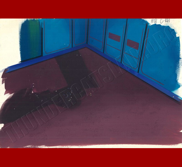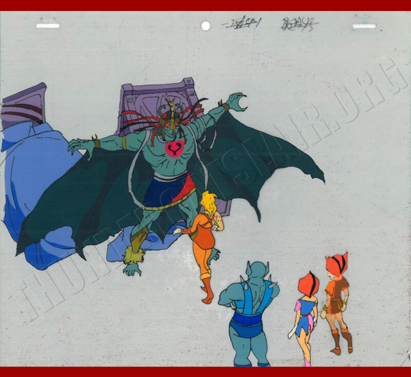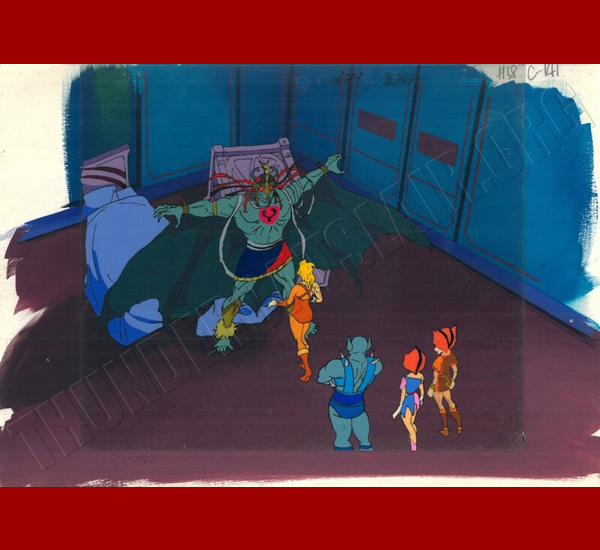Description: Full set-up of Mumm-Ra inside the Cats Lair (in the Thunder Kittens room to be exact). The beds that are overturned are on a cel layer, and are not part of the background. As usual, the background is handpainted in oils. I enjoy owning art of the bedrooms of the T-Cats, like the cel of inside Cheetara’s closet. I like the personalization effect it has. Of course, its hard to notice this when Mumm-Ra pulls a Freddy Kreuger on our favourite felines. |