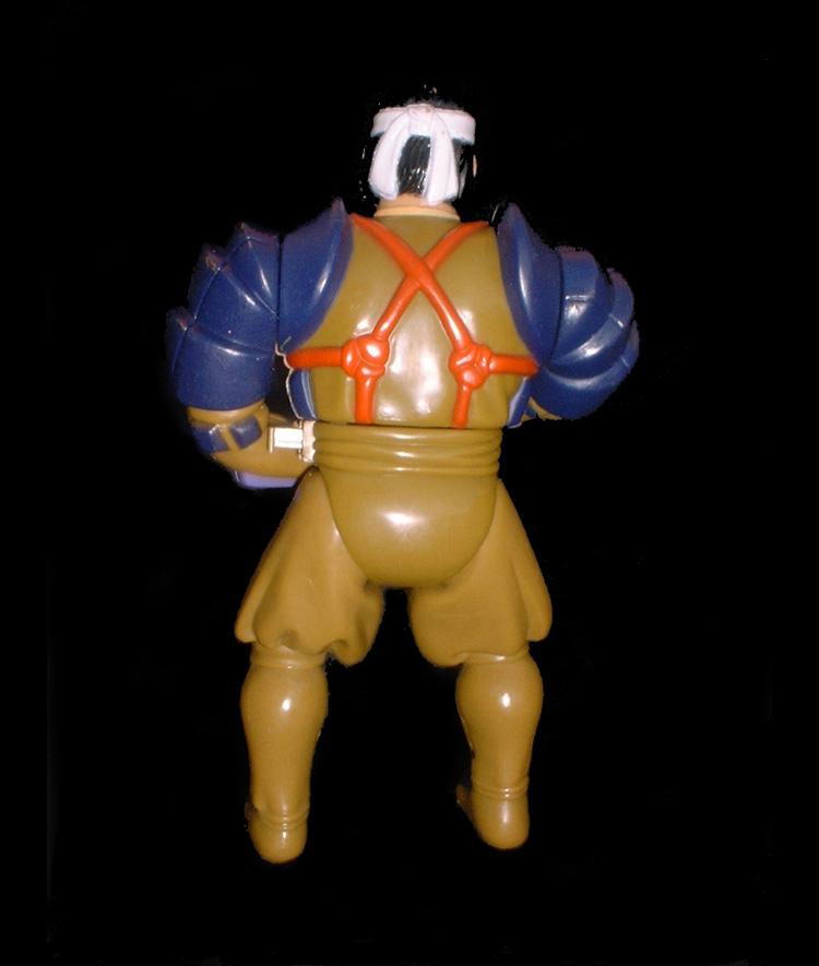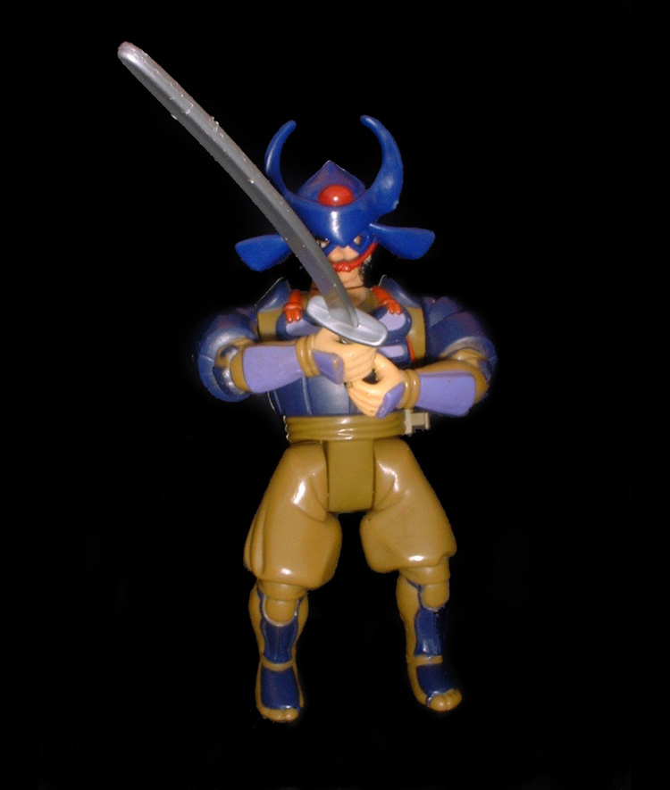Push in the button on the side of the figure to make Hachiman wield his sword into action.