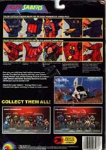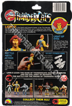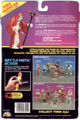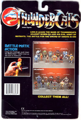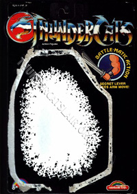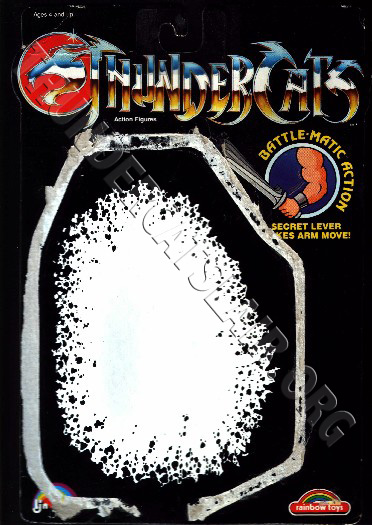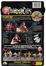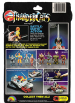 The 8-back package was an all black card with no white splash behind the figure. The back of the card pictured all 8 figures from the first series. The Thundertank, Nosediver, Skycutter and full size Sword of Omens were also pictured on the back of the cards, except for the Mumm-ra and Lion-o card backs.