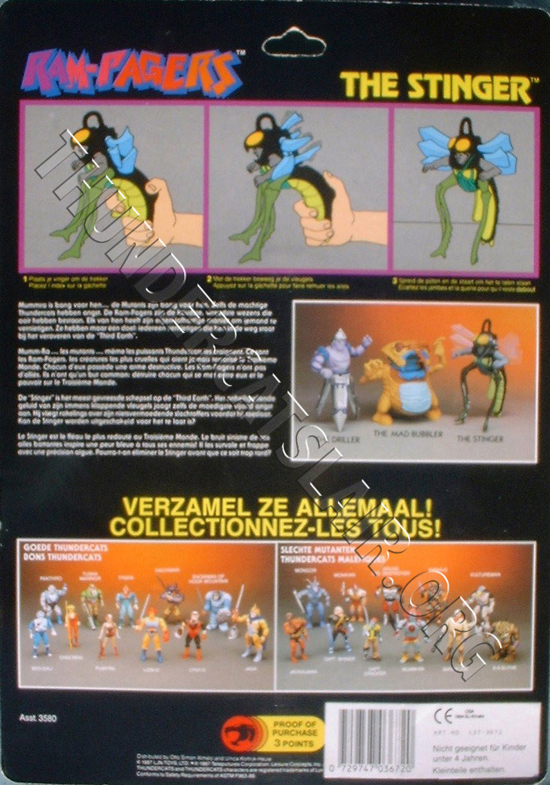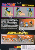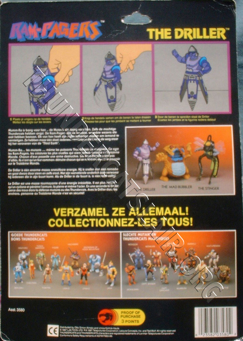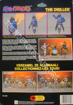 The Driller and Stinger card backs pictured all 22 regular action figures as well as a picture of the 3 Rampagers figures (the picture contained the un-produced Mad Bubbler figure) making it 25 figures in total, thus being referred to as 25-back. The card back also has a description of the Rampager, as well as instructions on his action feature. Both Rampager figures had a proof of purchase token worth 3 points.