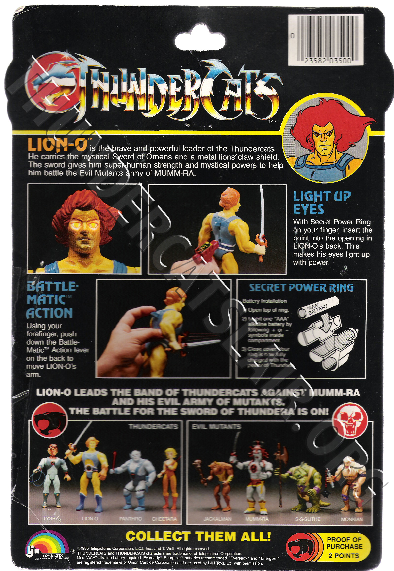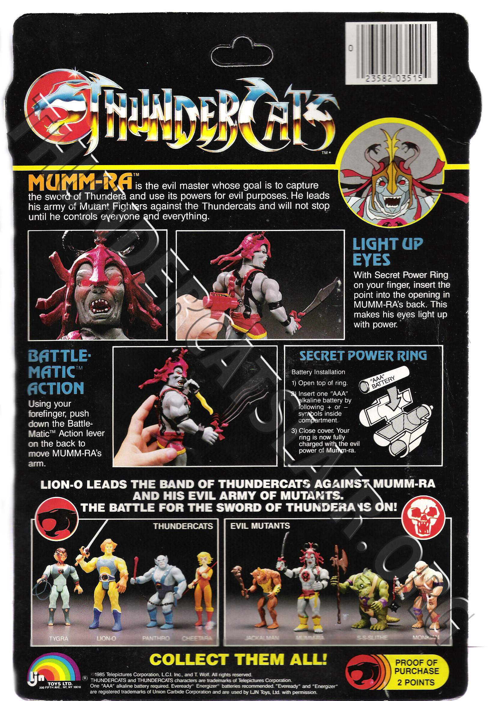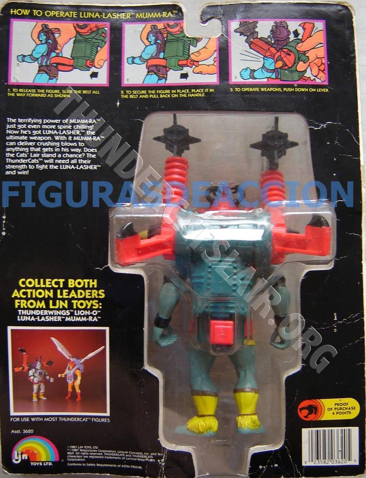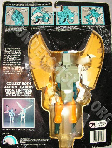 Right at the end of the toyline, LJN released packages of Mumm-Ra with Luna Lasher and Lion-o with Thunderwings packed together. These card backs contained instructions on using the figures, as well as an image displaying both two-packs. The Two-Packs had proof of purchase tokens to the value of 4 points.