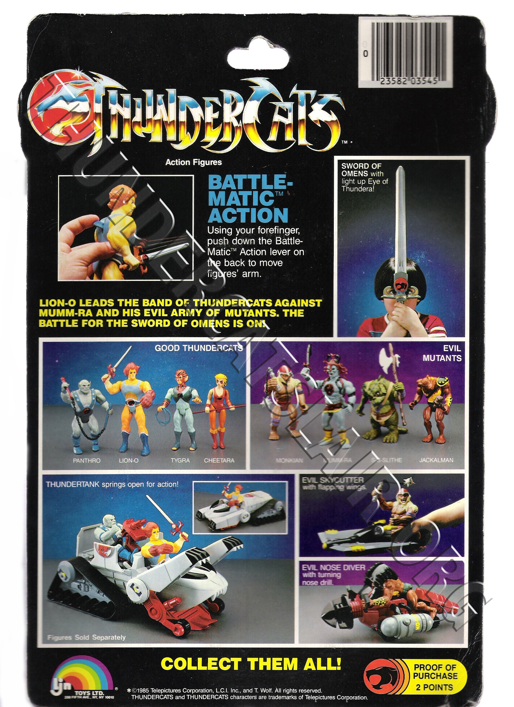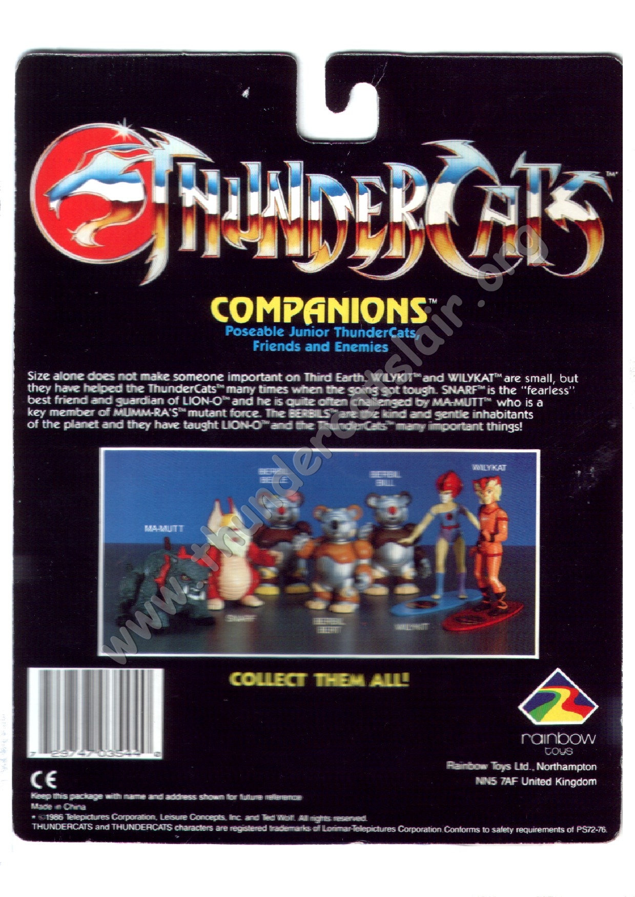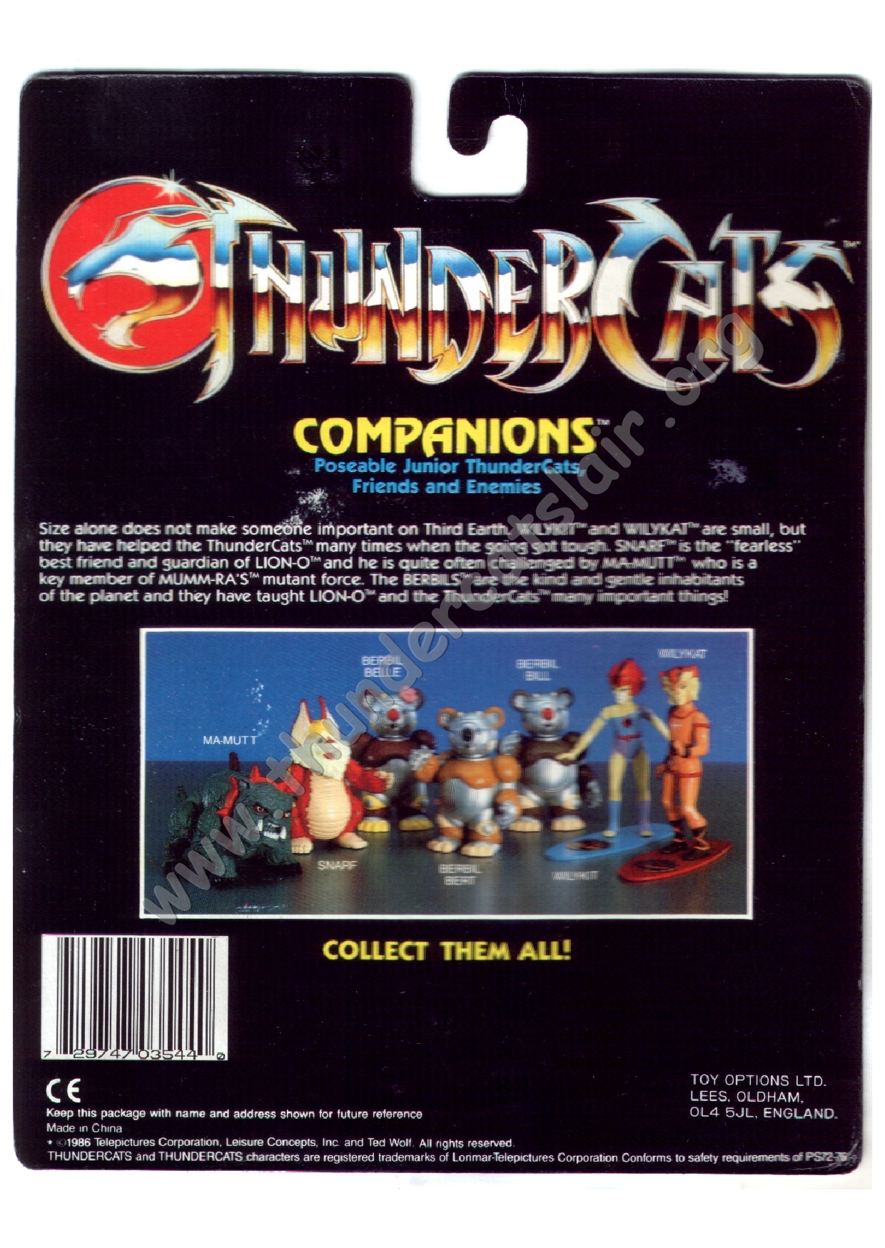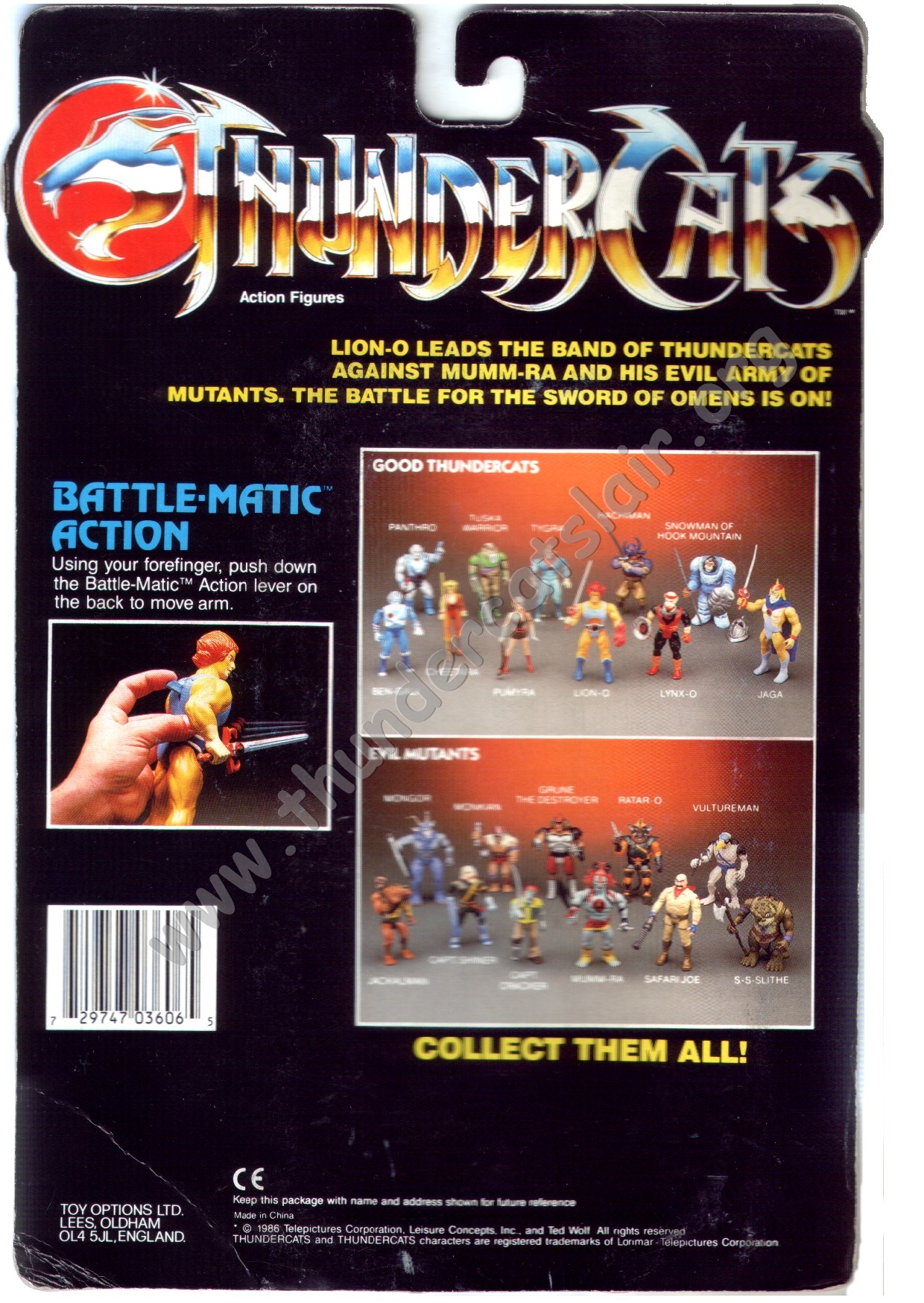 The 22-Back cards pictured every regular figure from the whole LJN Thundercats toyline, as it featured all 22 regular figures from the 3 series of figures released. The 8 new figures for series 3 were advertised on the card backs along with the 14 figures that covered the previous series of figures. The backs also had the same info on light up features for Lion-o and Mumm-ra and Battle-Matic action for the other 20 figures. In late 1988, a series of 22-back cards were released in the UK that only had an address for Toy Options limited. It is now known that these cards were actually produced by Rainbow Toys. The reason they contained the Toy Options address is because they were based in the same building. However it still seems odd that the Rainbow Toys logo is missing off these cards.