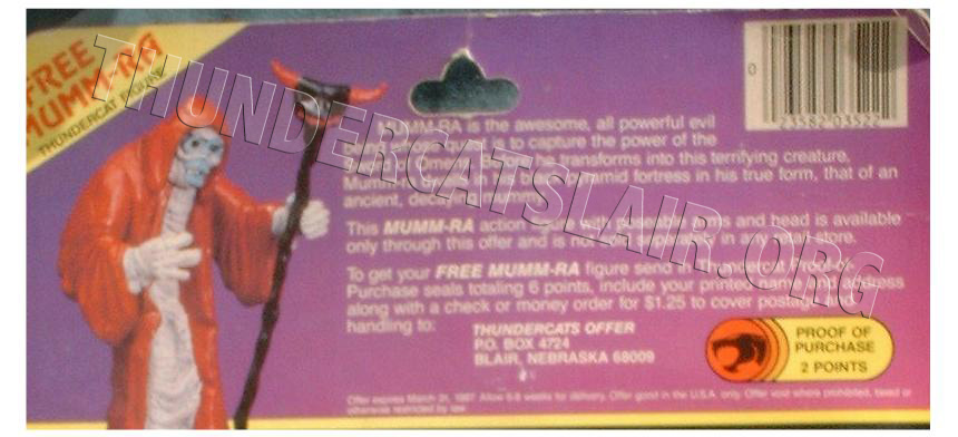 Also featured on the back of every series 2 card was full information on the mail-off Mumm-ra figure offer. It gave the details on how to send off for your free Mumm-ra figure. You were required to send off proof of purchase tokens up to the value of 6 points. Each series 2 figures card back contained a cut out token worth 2 points. Vehicles, Accessories and Playsets contained tokens worth more points than the figures (basically the more expensive the item, the more points it's token was worth)