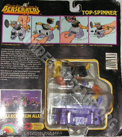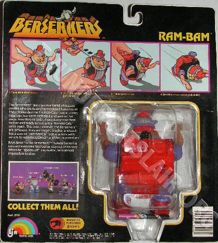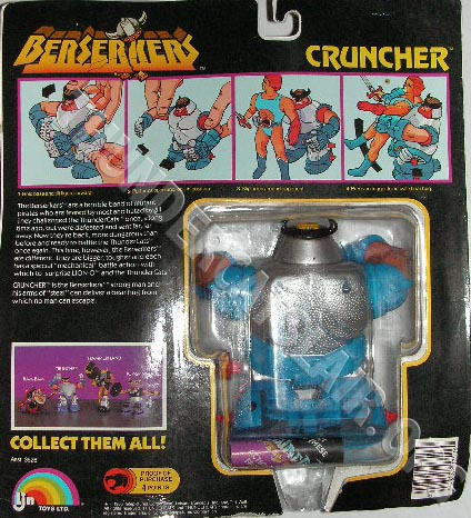 The Berserkers figures were packaged on quite large cards compared to the cards the regular figures were packed on. These were different to the way the regular 22 figures, Companions and Rampagers were packaged inside a blister sealed to the card. Instead the blisters edges were sandwiched inside the card, with the blister itself running through the card. The card backs contained instructions on how each individual Berserker figures action feature worked and pictured all 4 Berserker figures in the range, making them known as 4-back cards.