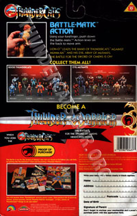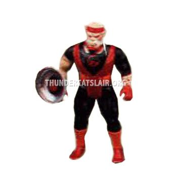 The 1987 (series 3) mini catalogues and 22-back card backs contain a group picture of all the regular good Thundercat figures together. However all the series 3 figures apart from Captain Cracker and Jaga have different accessories to those actually released with the figures. In this instance Lynx-O is pictured holding a shield that appears to resemble a dustbin lid. In the inner part of the shield is a black circular piece (it is uncertain whether this is painted or an actual piece of plastic), then inside is what looks like the Eye of Thundera symbol. The shield released resembles the cartoon shield much more than the version pictured here. It is thought that this was a very early prototype piece to photograph with the figure. It was later changed to the light shield with a much flatter base and the red pieces on the inner part of the shield. Like many other weapons that were originally shown, this shield was never released with the Lynx-O figure.