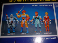 On most of the series 1 toy packaging, Tygra was pictured holding a whip that seemed to not include a handle or the yellow ballbearings. The whip rope looked the same as the released version and was just wound in a hoop (see pic) It is thought that this was a very early prototype piece to photograph with the figure. It was later changed to the whip with handle and two yellows ballbearings that all collectors know. Like many other weapons what was originally shown in early pictures, it was never released.