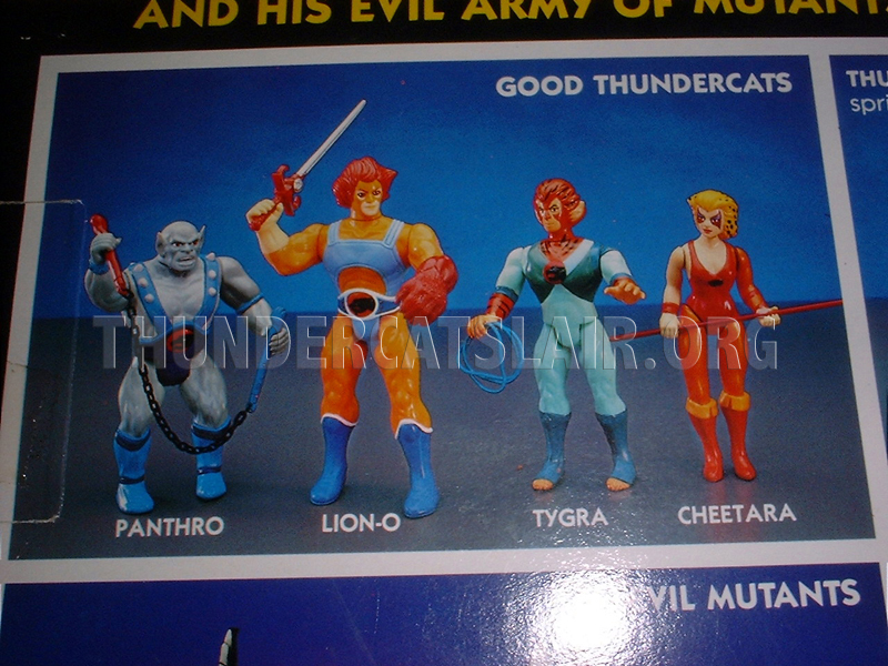 On most of the series 1 toy packaging, Tygra was pictured holding a whip that seemed to not include a handle or the yellow ballbearings. The whip rope looked the same as the released version and was just wound in a hoop (see pic) It is thought that this was a very early prototype piece to photograph with the figure. It was later changed to the whip with handle and two yellows ballbearings that all collectors know. Like many other weapons what was originally shown in early pictures, it was never released.